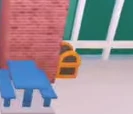 In the cafeteria where it is near a blue cafeteria table and a brick pillar. | |