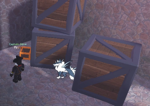 Next to the left wall of the dungeon, behind some crates. | |